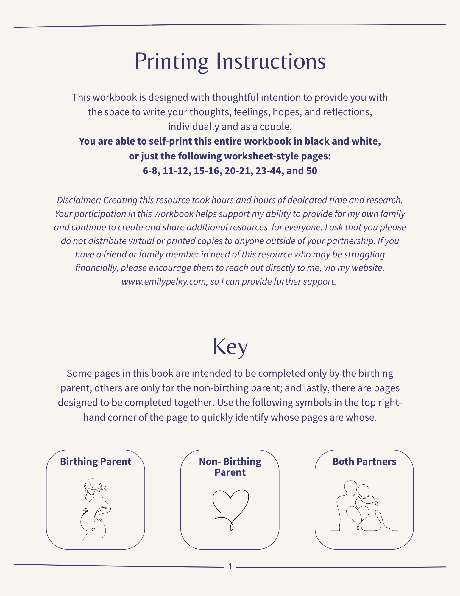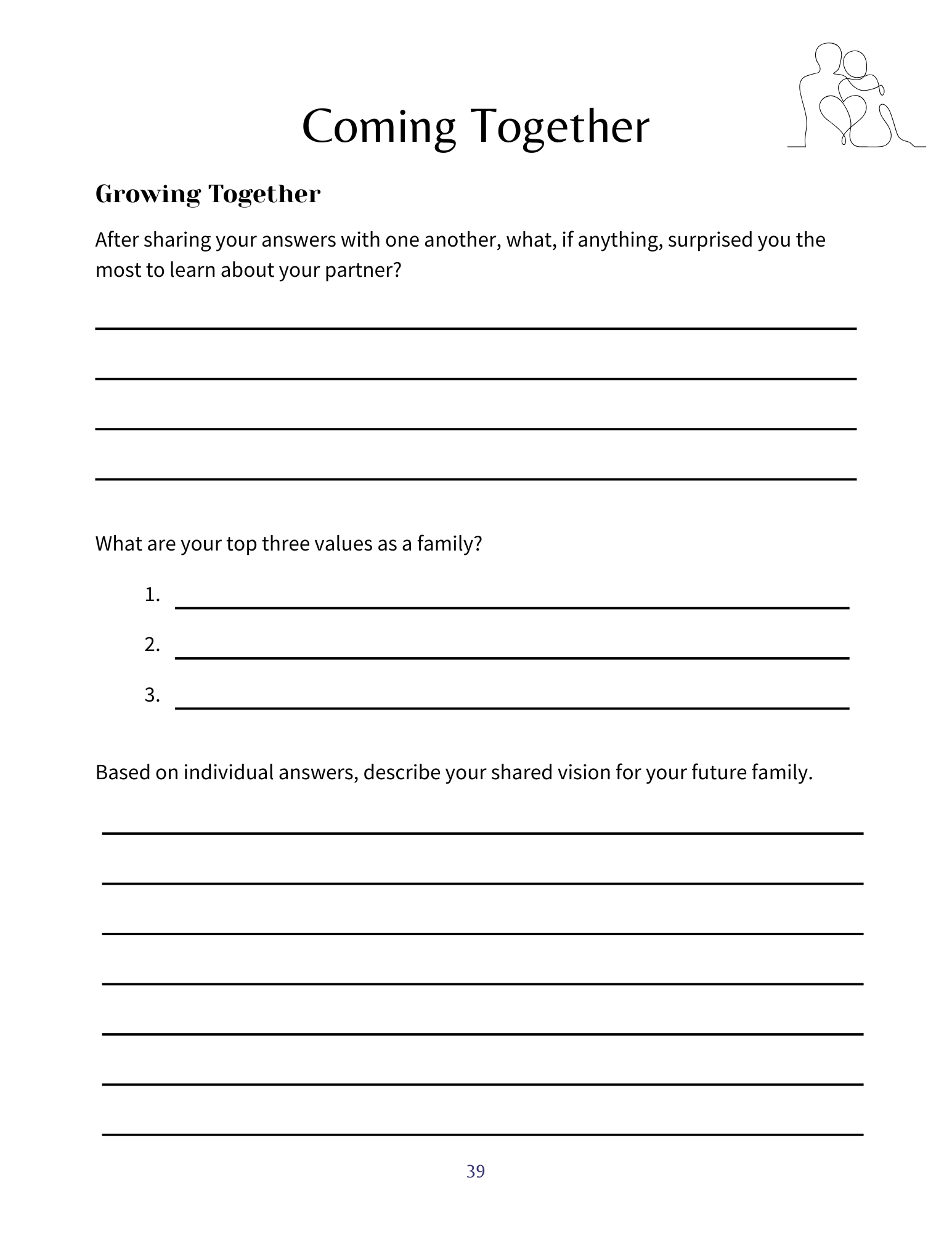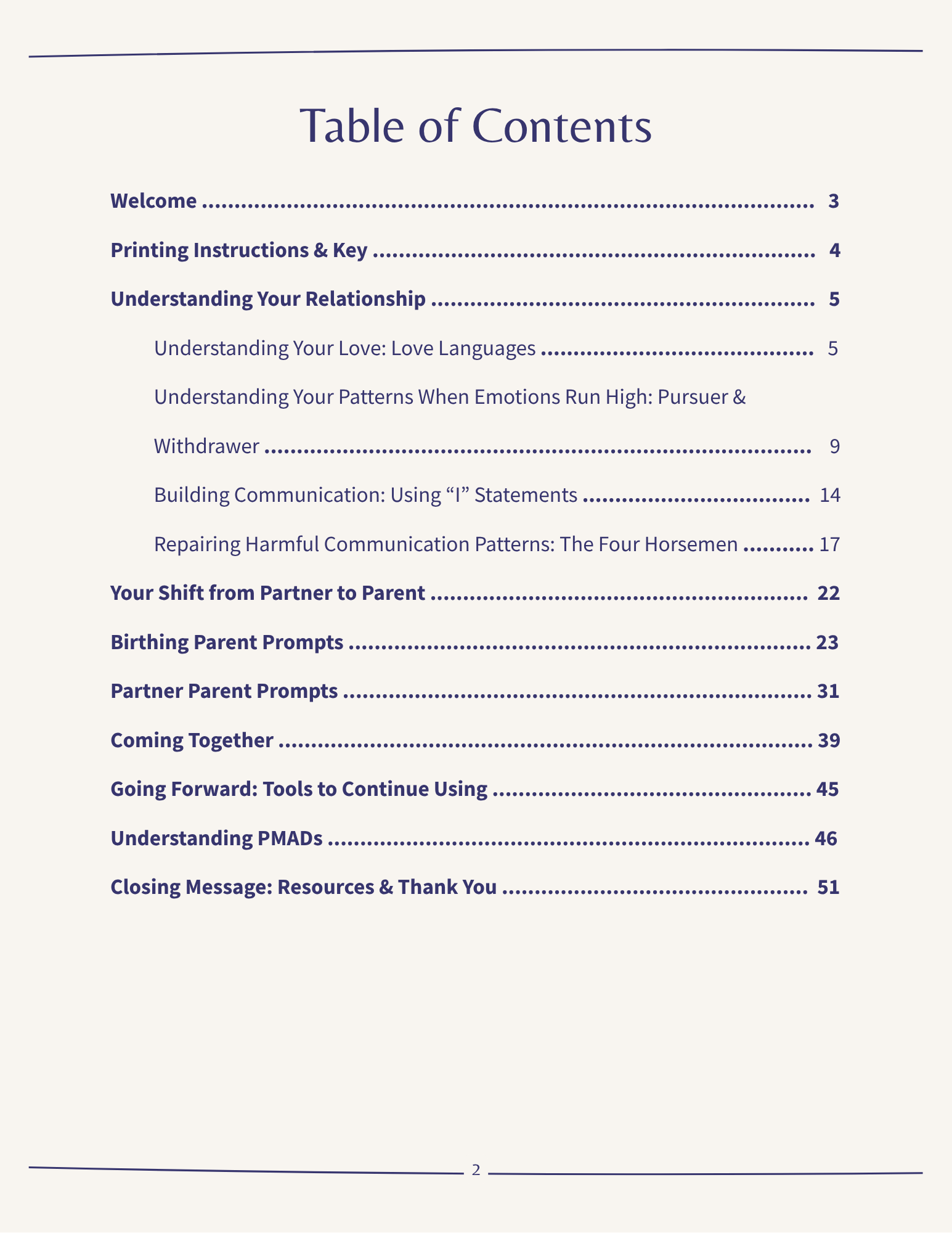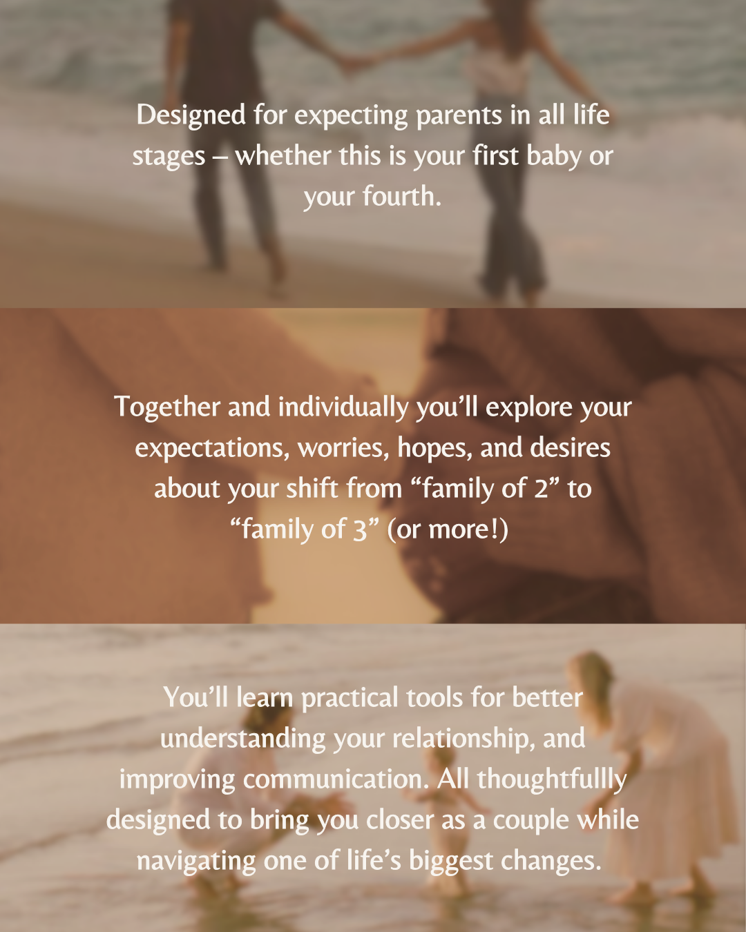 Youβll receive a printable digital workbook with 50 pages of tools and journal prompts designed to bring you closer as your family grows. You'll complete this workbook feeling connected, prepared, and confident about entering this new chapter together.